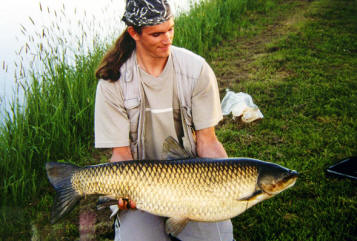 Tot mijn grote verrassing (en verbazing) zag ik bij het terugzetten van de karpe rdat een stukje verderop de andere korsten nog gewoon met veel kabaal uit het oppervlak gepakt werden! De karper komt ineens los! Snel de boel weer in orde maken, een nieuwe korst aan de haak en voorzichtig richting het geplons sluipen... Ik werp de korst in de buurt van de andere korsten en wacht rustig af. Een klein stukje verderop wordt weer een korst gegrepen, nu weer heel subtiel en alleen een boeggolf blijft als spoor achter. Na nog een tweetal korsten lijkt mijn korst aan de beurt... En klein stukje voor de korst zie ik een boeggolfje verschijnen. Een snuit doorbreekt het wateroppervlak en een bek pakt de korst netjes uit het oppervlak. Door het avondschemer en weerspiegeling op het wateroppervlak kan ik de vis zelf totaal niet zien (ook die polaroid bril helpt nu niet meer). Het wordt dus gokken wanneer ik moet aanslaan: te vroeg en je slaat de haak met korst en al er weer uit; te laat en de vis doen het voor je en gaat er als een speer vandoor... Even enkele seconden wachten en dan de gok wagen: de hengel flitst naar achteren en de lijn schiet strak over het water. Meteen draait de karper zich vliegensvlug om en gaat op volle kracht ervandoor. De hengel staat direct krom als een hoepeltje, de slip begint te gillen en een enorme boeggolf schiet de wetering over. Dit is een hele grote! Dat voel je meteen. Een enorme, niet te stoppen run volgt en ik zet de achtervolging in. De vis weet van geen ophouden en blijft maar gaan. Dan draait hij zich plotseling om en gaat met een nood gang de andere kant uit. Ik er maar weer achteraan. De vis bonkt nu laag bij de bodem. Ik heb de vis nog geen moment gezien en wordt nu toch wel nieuwsgierig naar het formaat. Deze vis is duidelijk sterker dan elke andere graskarper die ik